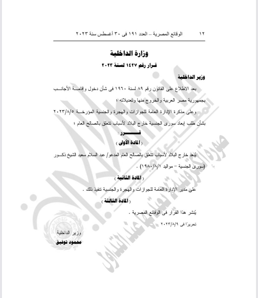 نشرت الجريدة الرسمية القرار رقم 1427 لسنة 2023 والخاص بدخول وإقامة الأجانب في جمهورية مصر العربية والخروج منها، والخاص بإبعاد سوري الجنسية خارج البلاد لأسباب تتعلق بالصالح العام.
