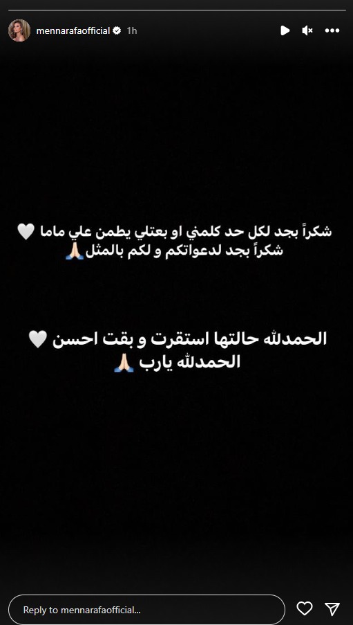 وكتبت منة عرفة عبر خاصية ستوري على حسابها الرسمي إنستجرام، الآتي: شكرًا بجد لكل حد كلمني أو بعتلي يطمن على ماما، شكرًا بجد لدعواتكم ولكم بالمثل، والحمد لله حالتها استقرت وبقت أحسن الحمد لله يارب.