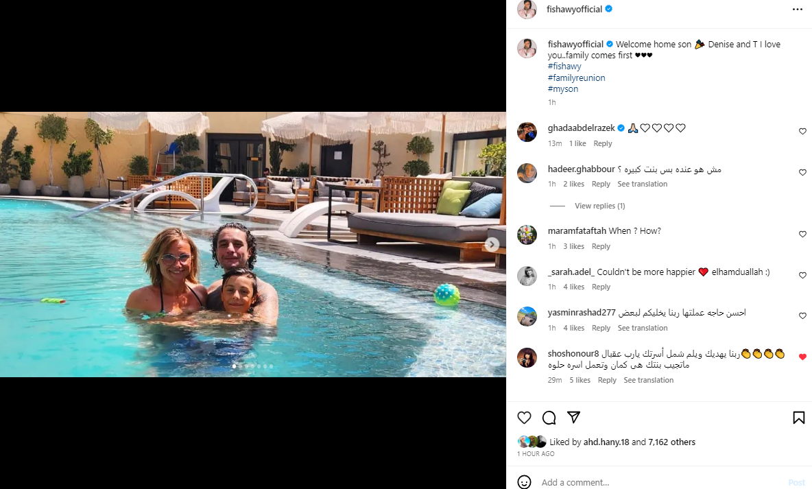 وجاء تساؤل الجمهور بعدما نشر أحمد الفيشاوي عبر حسابه الشخصي على إنستجرام، صور تجمعه بطليقته الألمانية وابنهما تتيوس، وعلق عليها: دينيس وتي أحبك، مرحبا بك في بيتك يا بني، العائلة تأتي أولًا.
