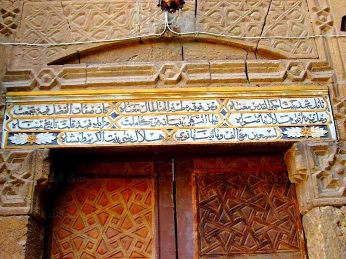 وأكد الزهار، أن كتلة المدخل يتوسطها فتحة دخول اتساعها 1.53م وارتفاعها 2.90م، ويغلق عليها باب خشبي من مصراعين ذو زخارف قوامها أطباق نجمية سداسية، ويكتنف المدخل مكسلتان -مصطبتان-، ويعلو فتحة الدخول عتب حجري كسي بلوح رخامي، نُقش عليه نص تأسيس المسجد بالحفر البارز بخط الثلث، موضحًا أنه نص من الشعر ينتهي بحساب الجمل وتاريخ الإنشاء هلال بنى بيت الكريم وأنشأه.