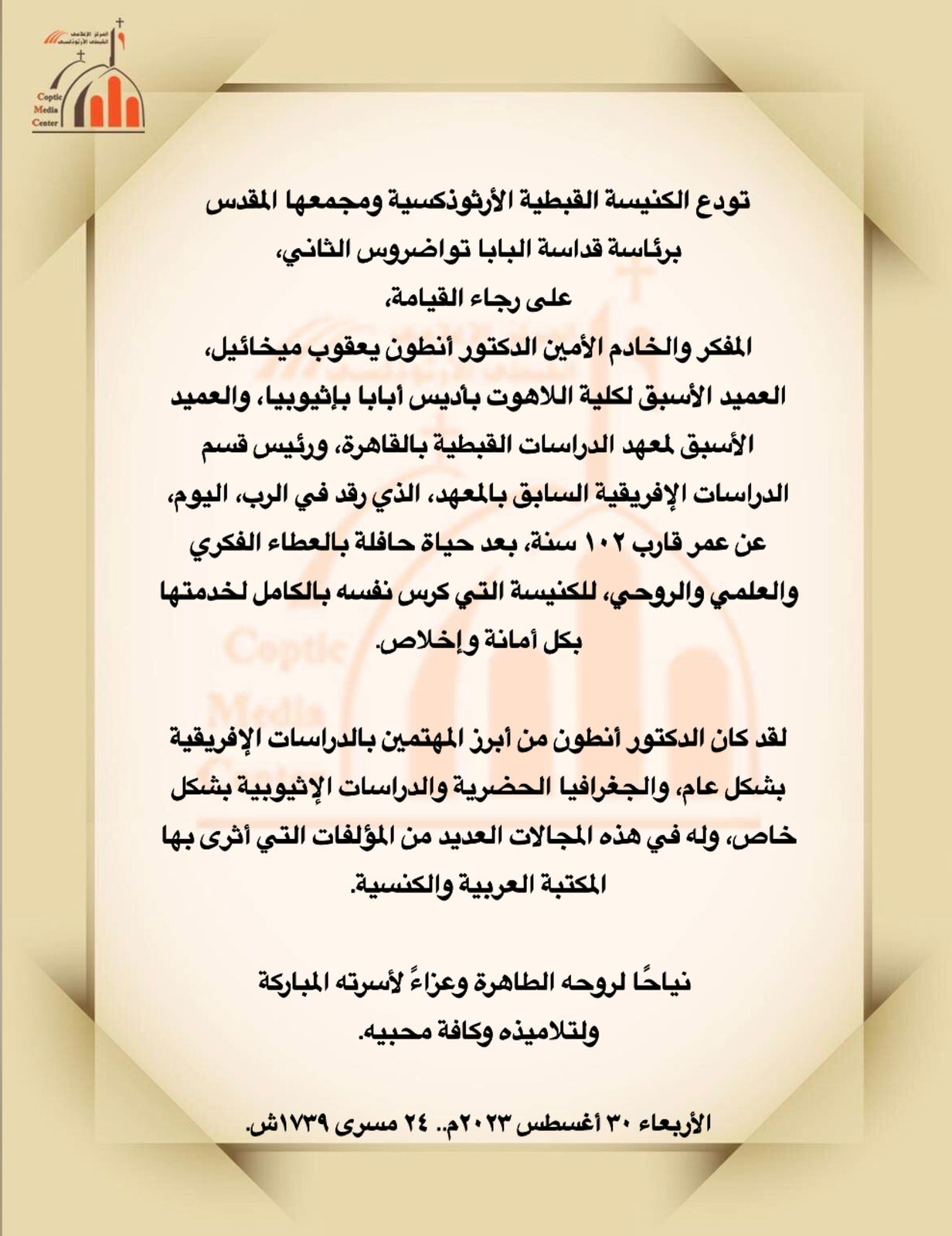 وقالت الكنيسة القبطية الأرثوذكسية في نعيها: تودع الكنيسة القبطية الأرثوذكسية ومجمعها المقدس برئاسة قداسة البابا تواضروس الثاني، على رجاء القيامة، المفكر والخادم الأمين الدكتور أنطون يعقوب ميخائيل، العميد الأسبق لكلية اللاهوت بأديس أبابا بإثيوبيا، والعميد الأسبق لمعهد الدراسات القبطية بالقاهرة، ورئيس قسم الدراسات الإفريقية السابق بالمعهد، الذي رقد في الرب، اليوم، عن عمر قارب 102 سنة، بعد حياة حافلة بالعطاء الفكري والعلمي والروحي، للكنيسة التي كرس نفسه بالكامل لخدمتها بكل أمانة وإخلاص.