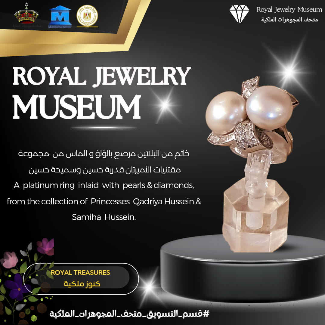 أعلنت إدارة متحف المجوهرات الملكية بالإسكندرية، عن عرض قطعة أثرية فريدة وهي عبارة عن، خاتم من البلاتين مرصع بالؤلؤ والماس من مجموعة مقتنيات الأميرتان قدرية حسين، وسميحة حسين.