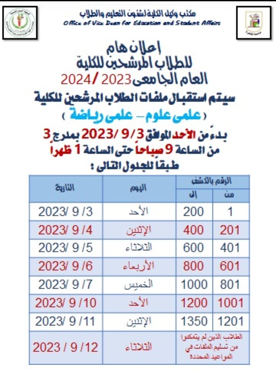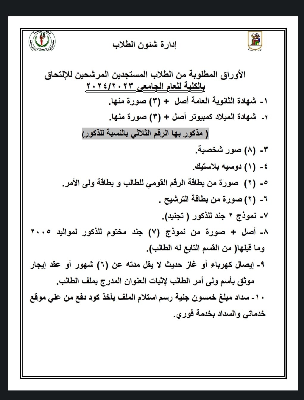 وأصدرت الكلية بيانًا أوضحت خلاله: إن بدء استقبال الملفات سيكون بداية من يوم الأحد 3 سبتمبر المقبل 2023 بمدرج 3 من الساعة الـ9 صباحًا حتى الـ1 ظهرًا، موضحة أن المستندات المطلوبة من الطلاب تشمل: شهادة الثانوية العامة، و3 صورة منها، شهادة الميلاد كمبيوتر أصل و3 صور منها، 8 2ور شخصية، دوسيه بلاستيك، 2 صورة من بطاقة الرقم القومي للطالب وبطاقة ولي الأمر، و2 صورة من بطاقة الترشيح، نموذج 2 جند للذكور ( تجنيد ).
