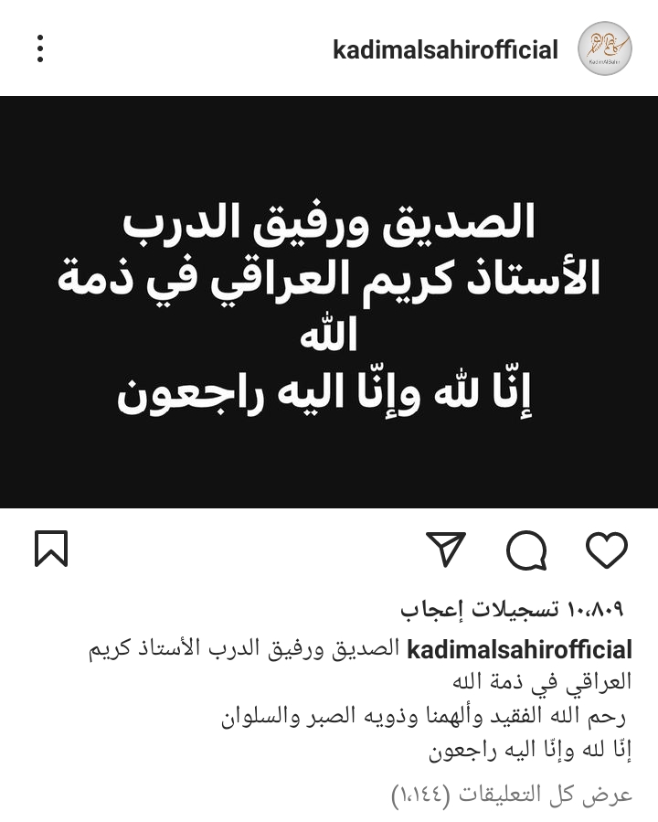 وكتب كاظم الساهر، منشورًا عبر حسابه الشخصي بموقع تبادل الصور والفيديوهات انستجرام: الصديق ورفيق الدرب الأستاذ كريم العراقي في ذمة الله، رحم الله الفقيد وألهمنا وذويه الصبر والسلوان، إنّا لله وإنّا اليه راجعون.