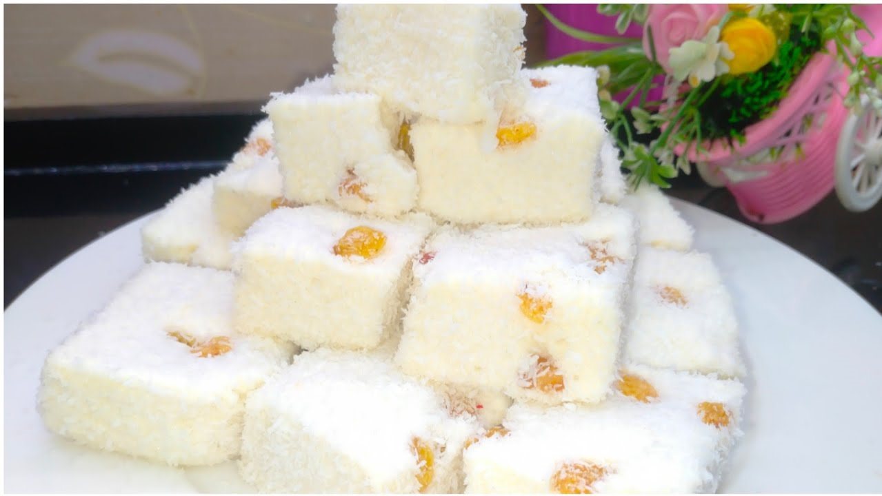 - تدهن الصينية بالزيت ويوضع فيها رشة من جوز الهند والخليط ثم يغطى بشكل تام بجوز الهند.