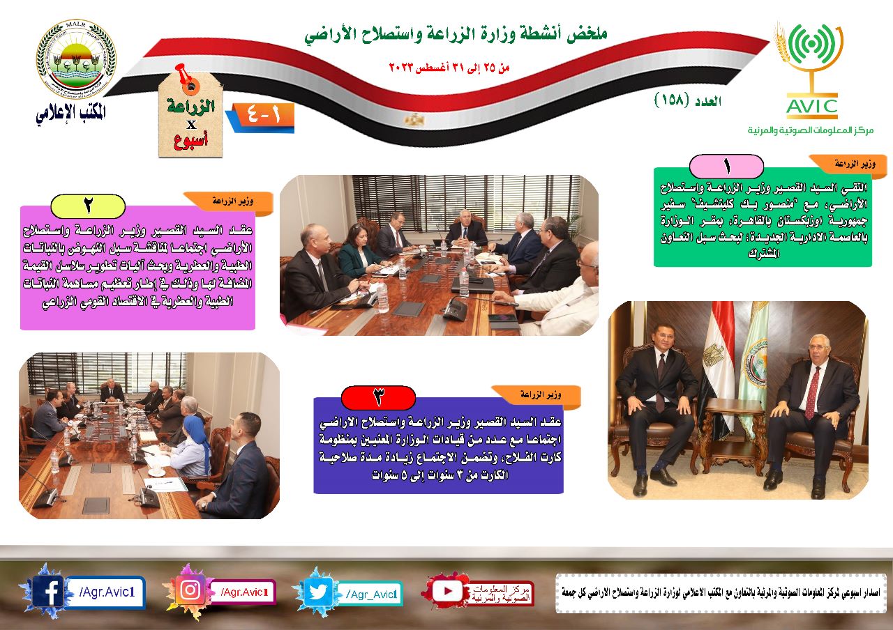 وسلط الانفوجراف الضوء على لقاء السيد القصير وزير الزراعة واستصلاح الأراضي، مع منصور بك كليتشيف سفير جمهورية أوزبكستان بالقاهرة، بمقر الوزارة بالعاصمة الإدارية الجديدة؛ لبحث سبل التعاون المشترك، فضلا عن الاجتماع الذي عقده وزير الزراعة، لمناقشة سبل النهوض بالنباتات الطبية والعطرية وبحث آليات تطوير سلاسل القيمة المضافة لها وذلك في إطار تعظيم مساهمة النباتات الطبية والعطرية في الاقتصاد القومي الزراعي، فضلا عن اجتماعه مع عدد من قيادات الوزارة المعنيين بمنظومة كارت الفلاح، وتضمن الاجتماع زيادة مدة صلاحية الكارت من 3 سنوات إلى 5 سنوات.