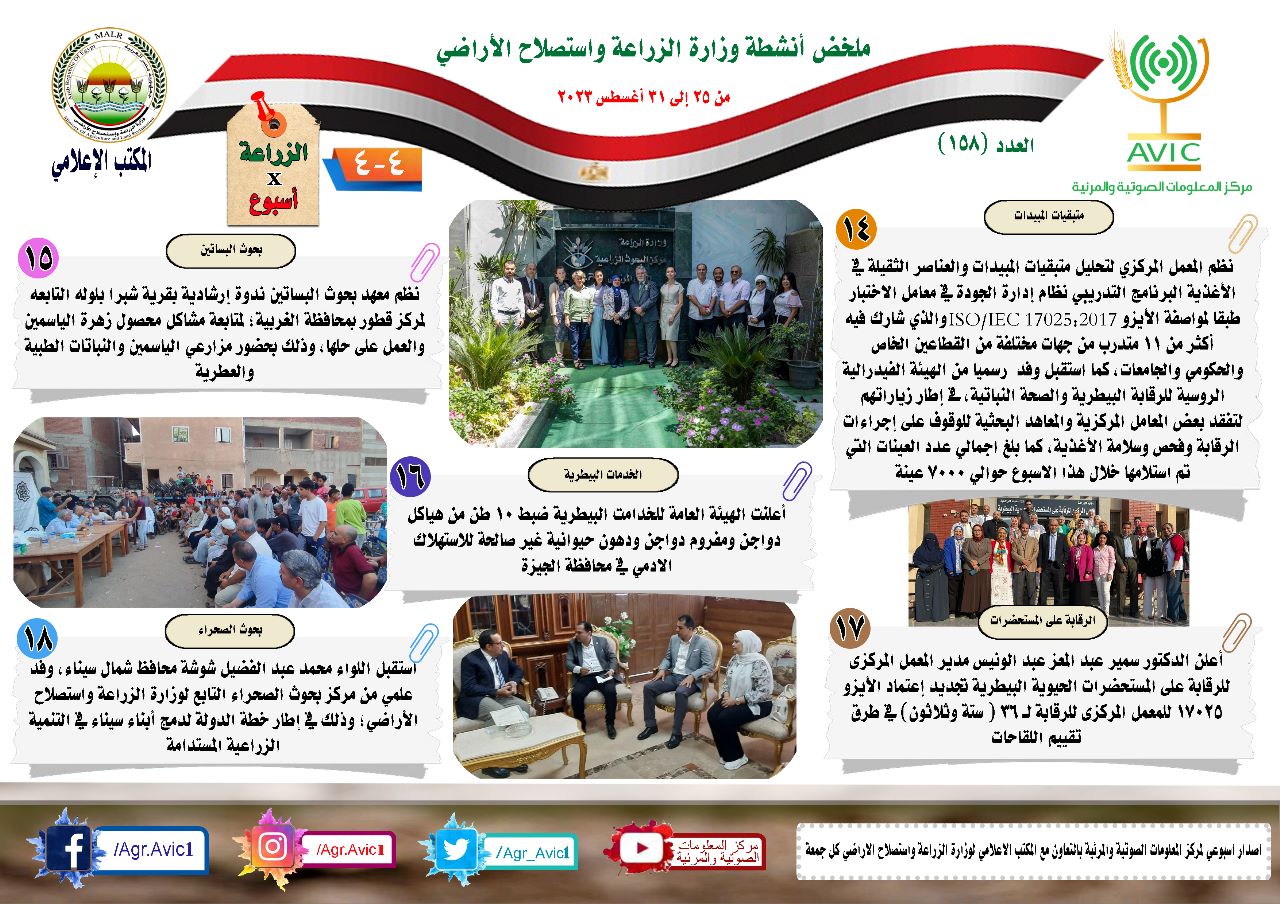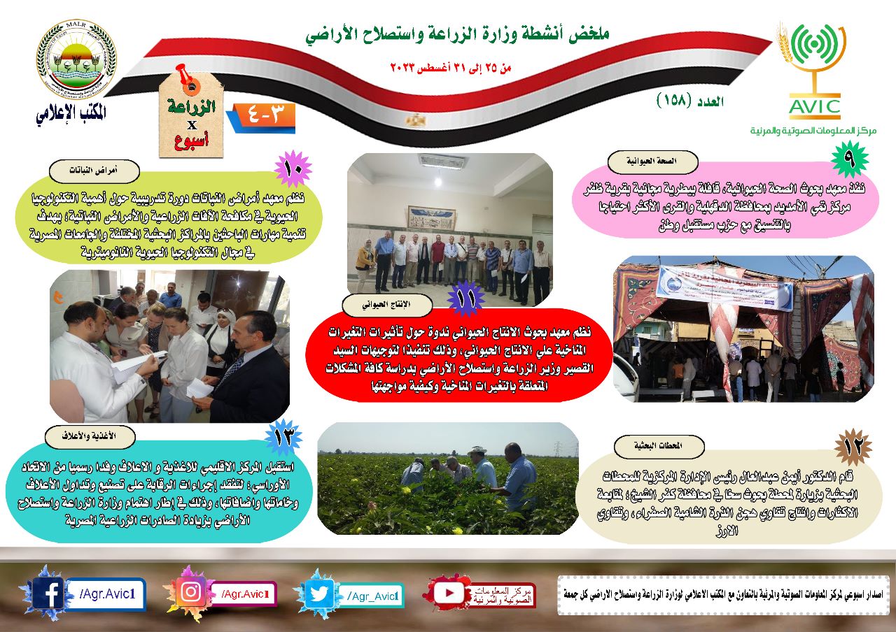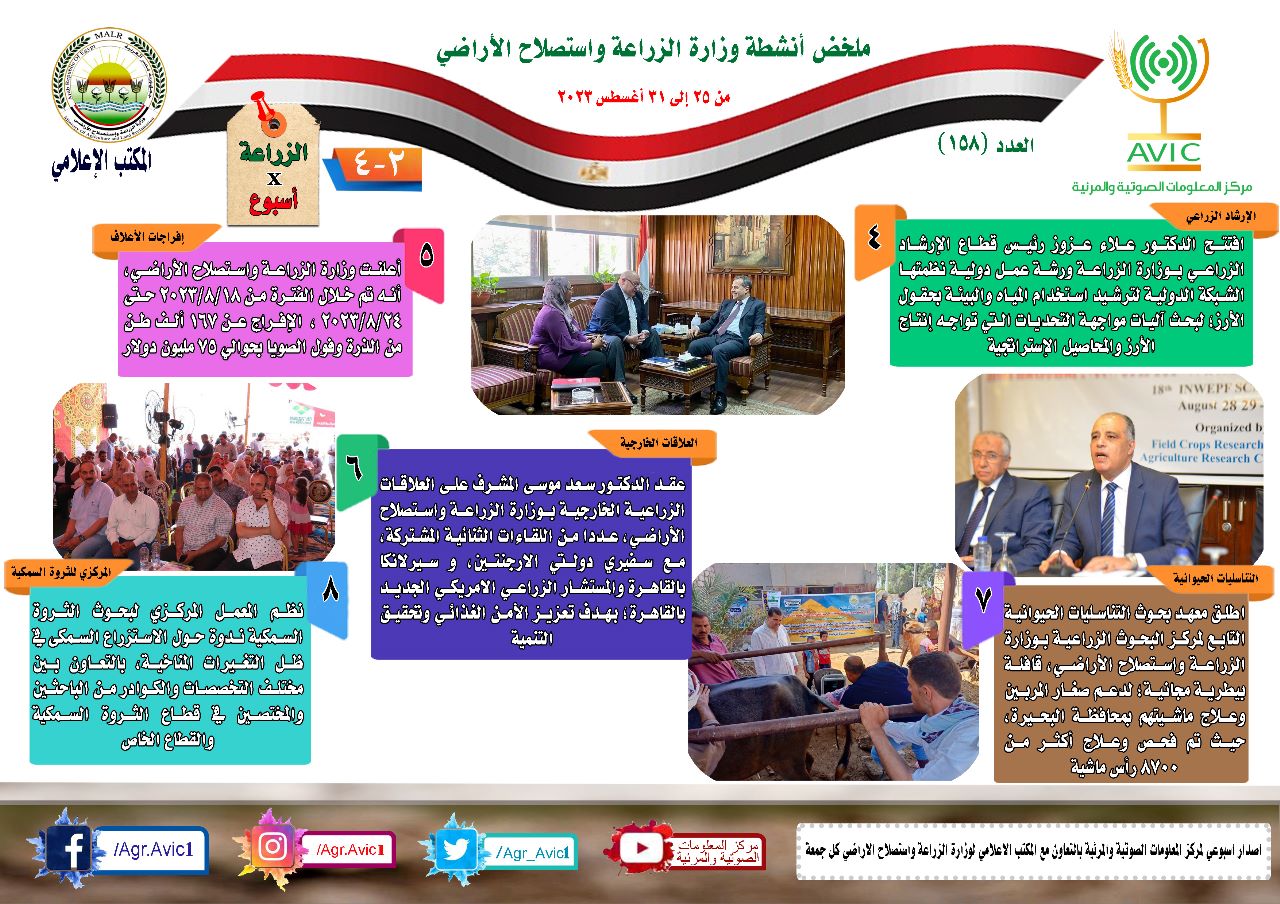 أصدر مركز المعلومات الصوتية والمرئية التابع لوزارة الزراعة واستصلاح الأراضي، "الانفوجراف الأسبوعي" في نسخته رقم 158، حول الحصاد الأسبوعي لأهم أنشطة الوزارة، خلال الأسبوع الماضي خلال الفترة من 25 وحتى 31 أغسطس لجاري، وذلك بالتعاون مع المكتب الإعلامي للوزارة.
