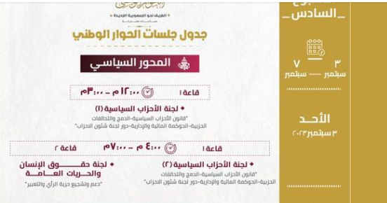 وتناقش لجنة الأحزاب السياسية بالمحور السياسي للحوار الوطني، قانون الأحزاب السياسية الدمج والتحالفات الحزبية - الحكومة المالية والإدارية، بالإضافة إلى مناقشة لجنة حقوق الإنسان والحريات العامة دعم وتشجيع حرية الرأي والتعبير.