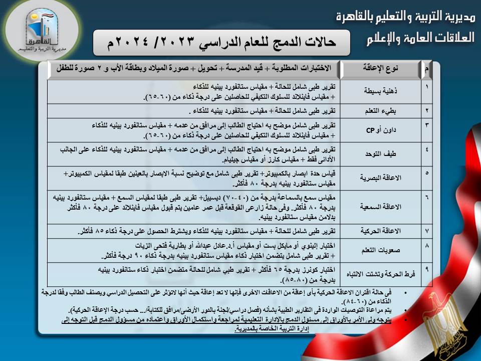 ووفقا للمنشور الصادر من مديرية التربية والتعليم بمحافظة القاهرة، ينتهي تقديم الطلبات لطلاب الدمج في 30-11-2023، على أن يتوجه واي الأمر بالأوراق إلى مسؤول الدمج بالإدارة التعليمية لمراجعة واستكمال الأوراق واعتماده من مسؤول الدمج قبل التوجه إلى إدارة التربية والتعليم بالمديرية.
