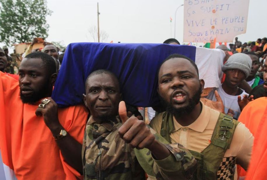 وخارج القاعدة العسكرية، وحمل المتظاهرون نعوش ملفوفة بالأعلام الفرنسية أمام صف من الجنود النيجيريين، وحمل آخرون لافتات تطالب فرنسا بالرحيل.