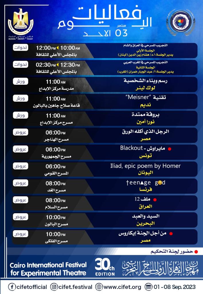 وفي تمام الساعة السادسة مساء، يعرض على المسرح القومي العرض اليوناني"Iliad، epic poem by Homer" وفي التوقيت نفسه يُعرض على مسرح الجمهورية التونسي "ما يراوش"، وفي نفس التوقيت يُقدم العرض المصري "الرجل الذي أكله الورق" على مسرح الهناجر، وفي تمام الساعة الثامنة مساء يُقدم العرض الفرنسي "Teenage god" على مسرح الغد، وفى التوقيت ذاته يُقدم العرض العراقي "ملف 12" على مسرح السلام، وفي تمام الساعة العاشرة مساء يُقدم العرض البحريني "السيد والعبد" على مسرح البالون، وفي التوقيت نفسه يُقدم العرض المصري "الجنة من أجل إيكاروس" على مسرح الفلكي.