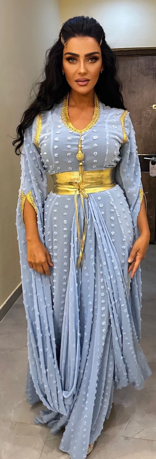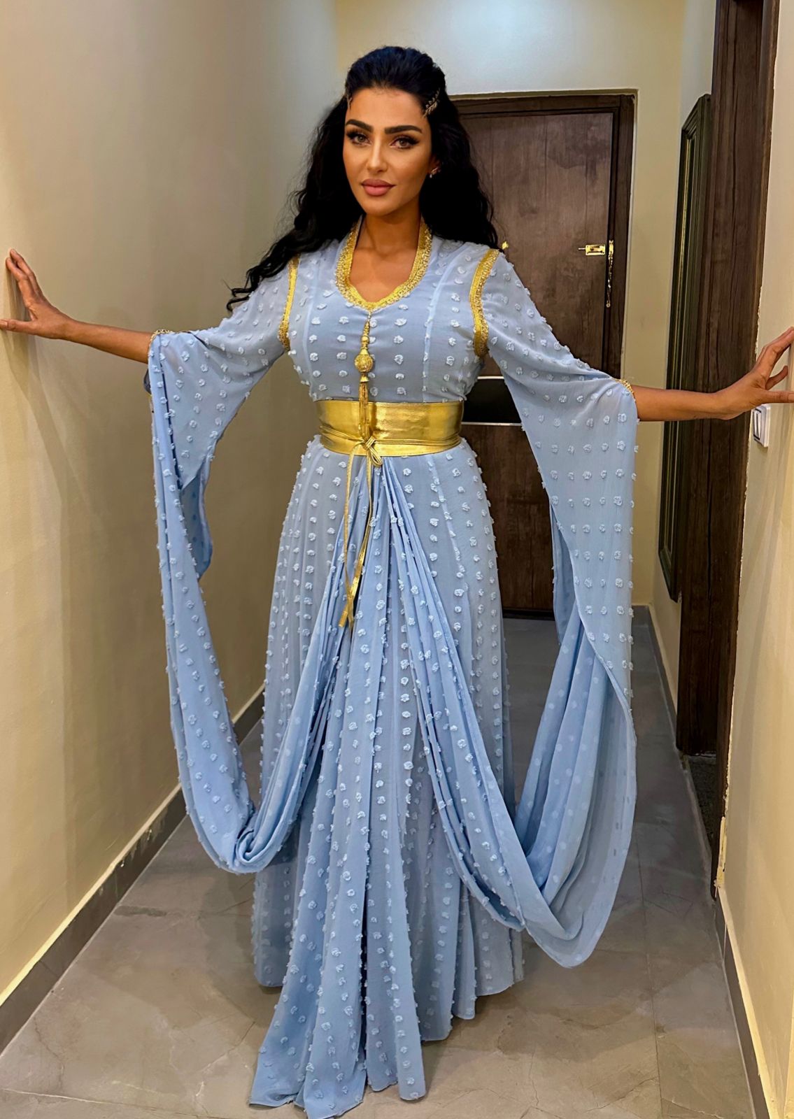 واختارت هبة الأباصيري، إطلالة رقيقة حيث ارتدت فستانا طويلا باللون الأزرق مع بعض الإكسسورات باللون الذهبي، بجانب وضعها مكياج خفيف أبرز جمال ملامحها.