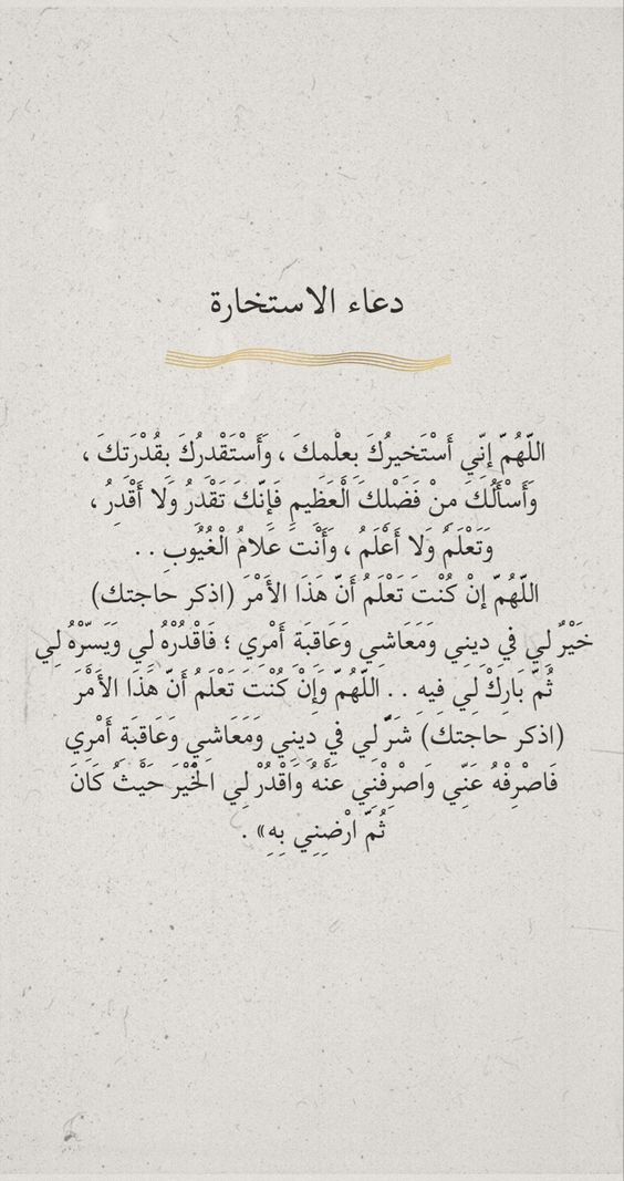 "اللَّهُمَّ إِنِّي أَسْتَخِيرُكَ بِعِلْمِكَ وَأَسْتَقْدِرُكَ بِقُدْرَتِكَ وَأَسْأَلُكَ مِنْ فَضْلِكَ العظيم، فَإِنَّكَ تَقْدِرُ وَلا أَقْدِرُ وَتَعْلَمُ وَلا أَعْلَمُ وَأَنْتَ عَلامُ الْغُيُوبِ اللَّهُمَّ فَإِنْ كُنْتَ تَعْلَمُ أن هَذَا الأَمْرَ ثُمَّ تُسَمِّيهِ بِعَيْنِهِ خَيْرٌ لِي فِي عَاجِلِ أَمْرِي وَآجِلِهِ قَالَ أَوْ فِي دِينِي وَمَعَاشِي وَعَاقِبَةِ أَمْرِي فَاقْدُرْهُ لِي وَيَسِّرْهُ لِي ثُمَّ بَارِكْ لِي فِيهِ اللَّهُمَّ وَإِنْ كُنْتَ تَعْلَمُ أَنَّهُ شَرٌّ لِي فِي دِينِي وَمَعَاشِي وَعَاقِبَةِ أَمْرِي أَوْ قَالَ فِي عَاجِلِ أَمْرِي وَآجِلِهِ فَاصْرِفْنِي عَنْهُ واصرفه عني وَاقْدُرْ لِي الْخَيْرَ حَيْثُ كَانَ ثُمَّ رَضِّنِي بِهِ".