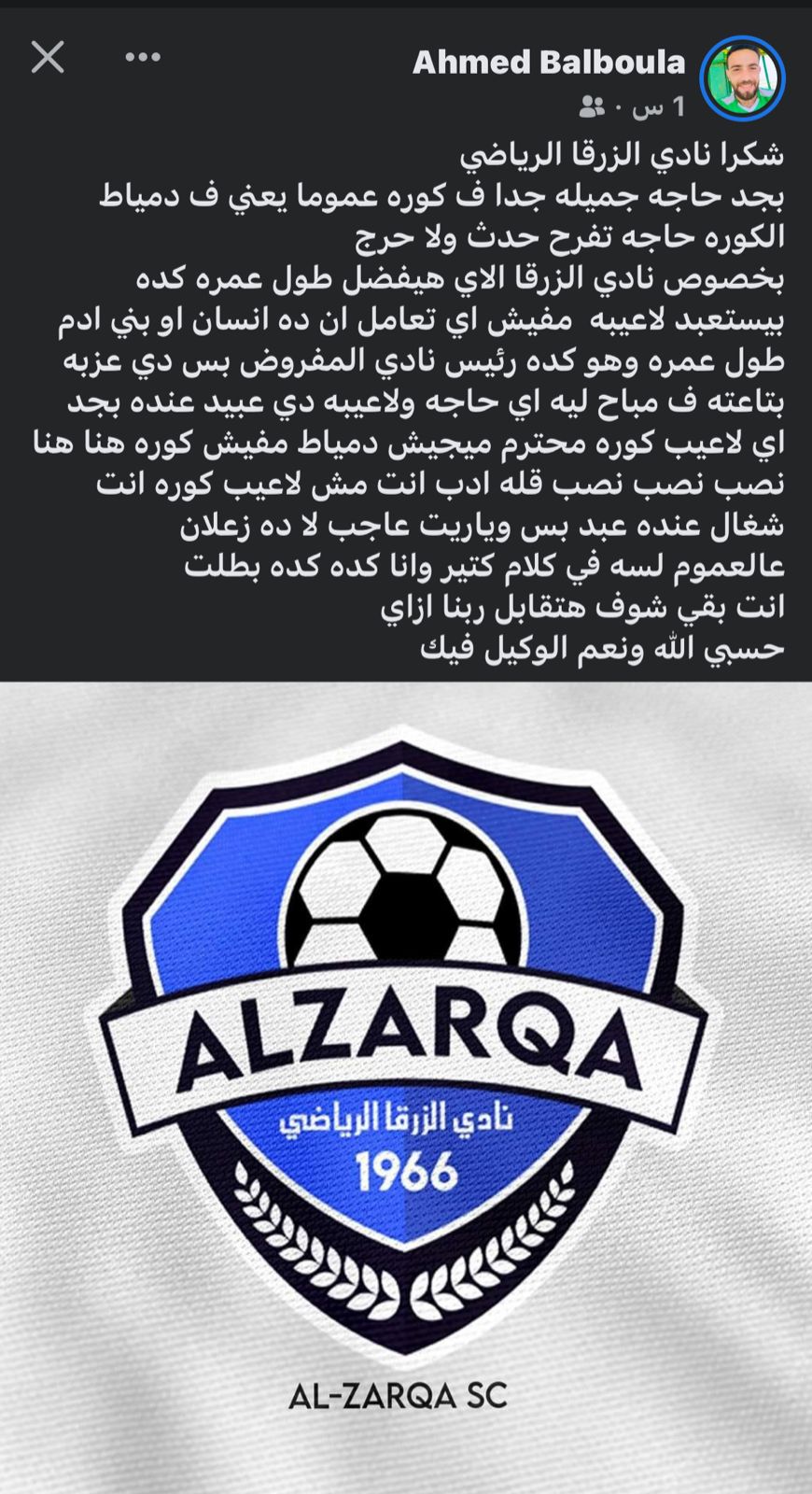 وقال بلبولة، عبر صفحته الرسمية على الفيسبوك: شكرا نادي الزرقا الرياضي، بجد حاجة جميله جدا في الكورة، حاجة تفرح، حدث ولا حرج، بخصوص نادي الزرقا اللي هيفضل طول عمره كده بيستعبد لاعيبة مفيش أي تعامل إن ده إنسان أو بني آدم طول عمره.