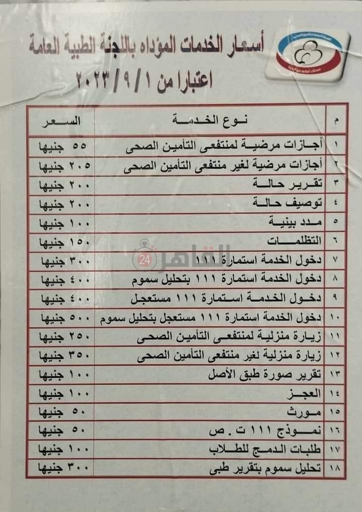 واعتمدت هيئة التأمين الصحي، الأسعار الجديدة لخدمات اللجان الطبية العامة، والتي حصل القاهرة 24 على نسخة منها، على أن يتم تطبيقها بداية من شهر سبتمبر الجاري.