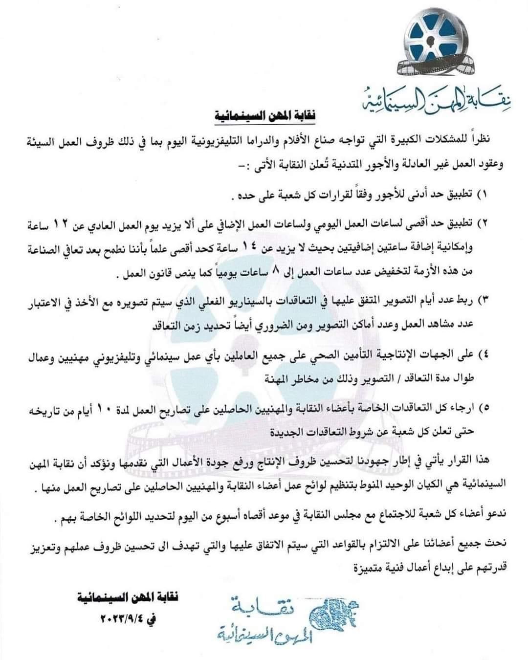 وجاء في البيان الذي أصدرته نقابة المهن السينمائية: نظرًا للمشكلات الكبيرة التي تواجه صناع الأفلام والدراما التليفزيونية اليوم، بما في ذلك ظروف العمل السيئة وعقود العمل غير العادلة والأجور المتدنية.