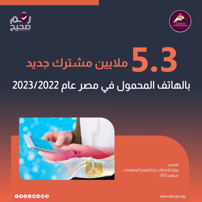وأوضح مركز المعلومات، أنه وفقًا لأحدث بيان لوزارة الاتصالات وتكنولوجيا المعلومات، ارتفع عدد مشتركي الهاتف المحمول في مصر ليصل إلى 103.6 ملايين مشترك، بزيادة قدرها 5.3 ملايين مشترك جديد بالهاتف المحمول في مصر عام 2022/2023.
