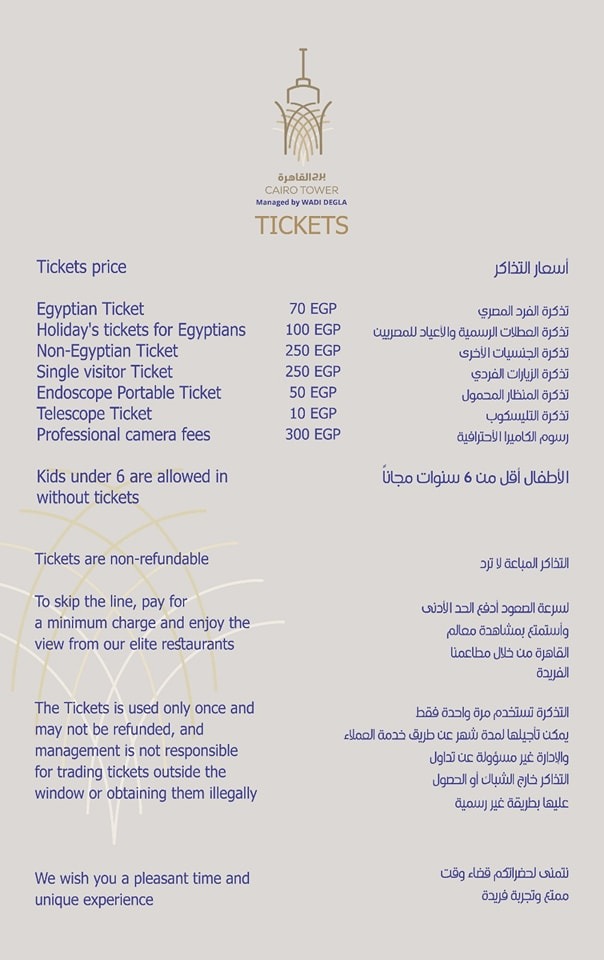 أعلنت إدارة برج القاهرة عبر الصفحة الرسمية علي فيس بوك، عن زيادة أسعار التذاكر الخاصة بالبرج بمقدار 10 جنيهات، لتصبح قيمة تذكرة الفرد للمصريين 70 جنيها بدلا من 60 جنيها، بداية من سبتمبر الجاري.