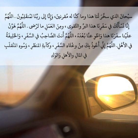 "الله أكبر، الله أكبر، الله أكبر، سبحان الذي سخر لنا هذا وما كنا له مقرنين، وإنا إلى ربنا لمنقلبون، اللهم إنا نسألك في سفرنا هذا البر والتقوى، ومن العمل ما ترضى، اللهم هون علينا سفرنا هذا، واطو عنا بعده، اللهم أنت الصاحب في السفر والخليفة في الأهل، اللهم إني أعوذ بك من وعثاء السفر وكآبة المنظر وسوء المنقلب في المال والأهل والولد".