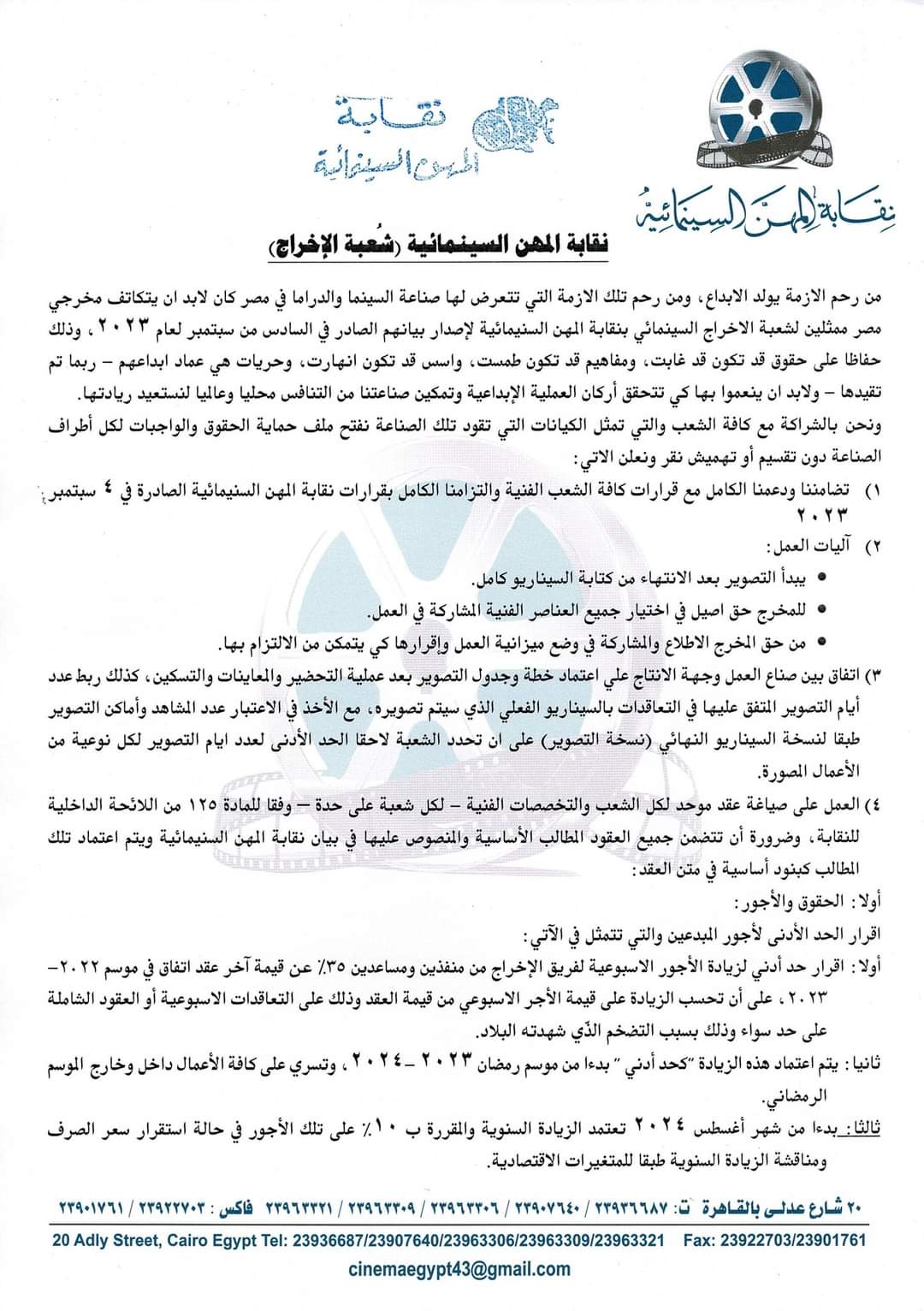 إقرار الحد الأدنى لأجور المبدعين والتي تتمثل في الآتي: أولا: إقرار حد أدني لزيادة الأجور الإسبوعية لفريق الإخراج من منفذين ومساعدين 35% عن قيمة آخر عقد اتفاق في موسم 2023، على أن تحسب الزيادة على قيمة الأجر الإسبوعي من قيمة العقد وذلك على التعاقدات الإسبوعية أو العقود الشاملة على حد سواء وذلك بسبب التضخم الذي شهدته البلاد.