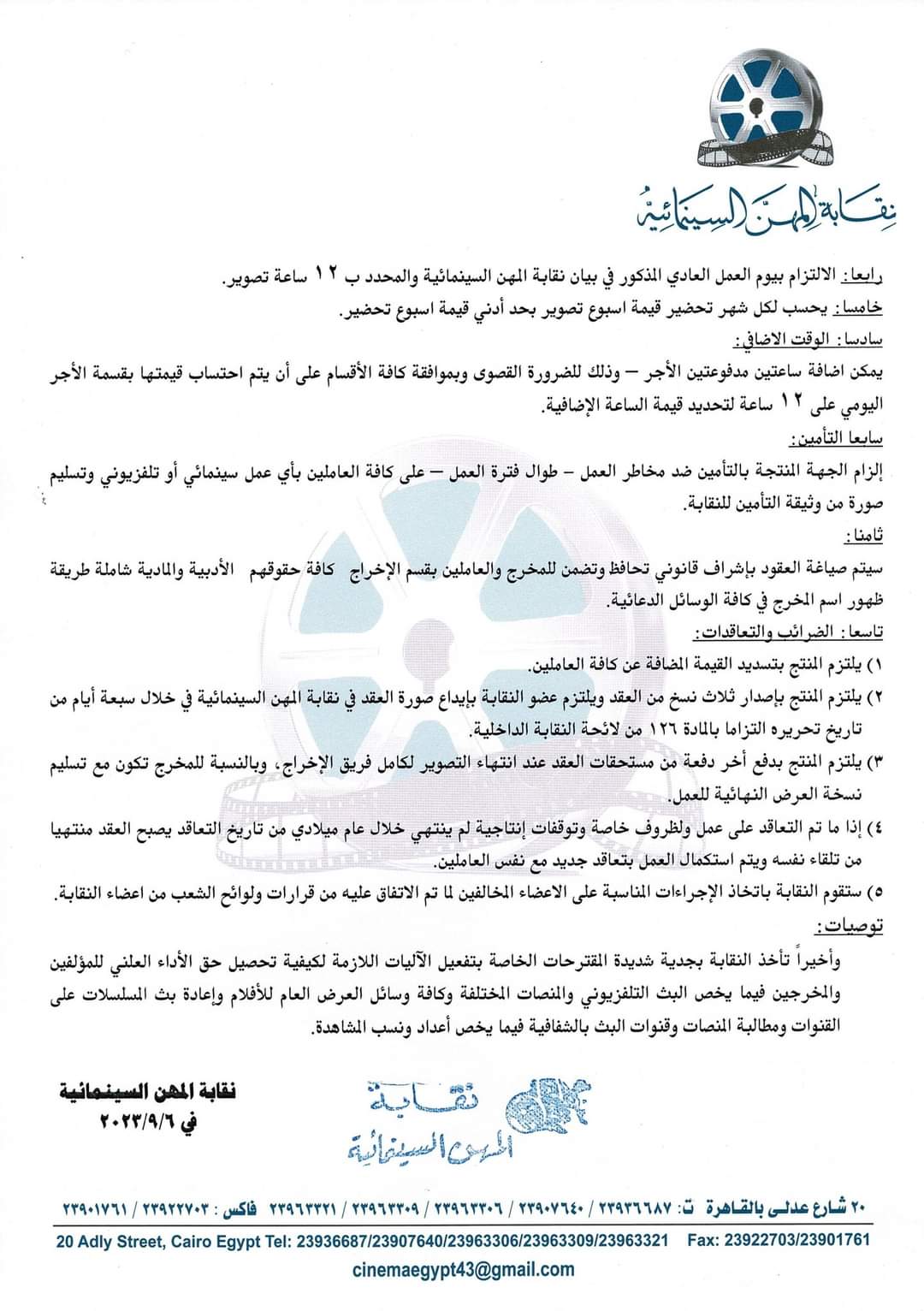 - رابعًا: الالتزام بيوم العمل العادي المذكور في بيان نقابة المهن السينمائية والمحدد.