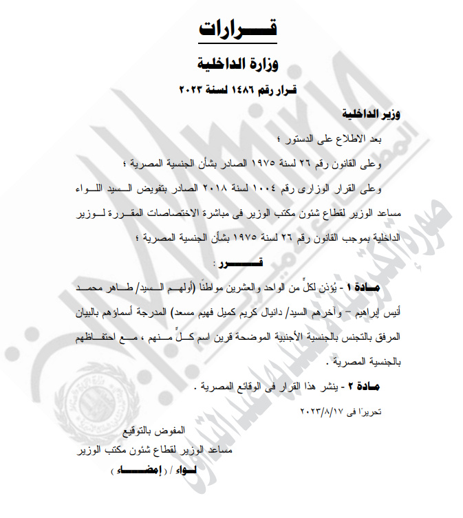 وجاء القرار المنشور في الجريدة الرسمية، بعد الاطلاع على قرار رقم 26 لسنة 1975 بشأن الجنسية المصرية؛ وعلى القرار الوزاري رقم 1004 لسنة 2018 الصادر بتفويض السيد اللواء مساعد الوزير لقطاع شئون مكتب الوزير في مباشرة الاختصاصات المقررة لوزير الداخلية.
