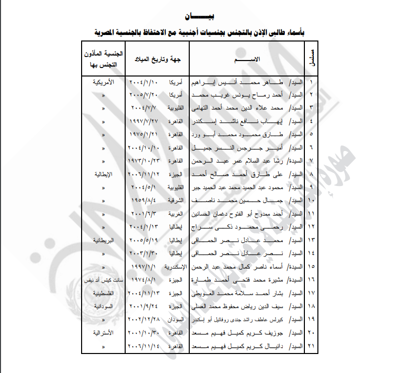 قرار وزاري بمنح 21 مواطنًا الجنسية الأجنبية مع الاحتفاظ بالمصرية | صور