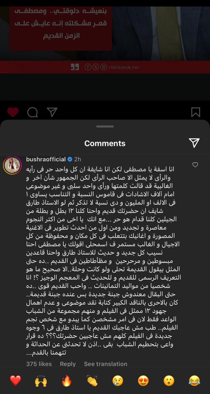 وكتبت بشرى تعليقًا لدى منشور مصطفى قمر، على انستجرام، قائلةً: أنا آسفة يا مصطفى لكن أنا شايفة إن كل واحد حر في رأيه والرأي لا يمثل إلا صاحب الرأي لكن الجمهور شأن آخر والغالبية قد قالت كلمتها ورأي واحد سلبي وغير موضوي أمام آلاف الإشادات في قاموس النسبة والتناسب يساوي 1 في الألف أو المليون ودي نسبة لا تُذكر ثم لو الأستاذ طارق شايف إن حضرتك قديم واحنا كلنا 12 بطل وبطلة من الجيلين كلنا قدان هو حر.