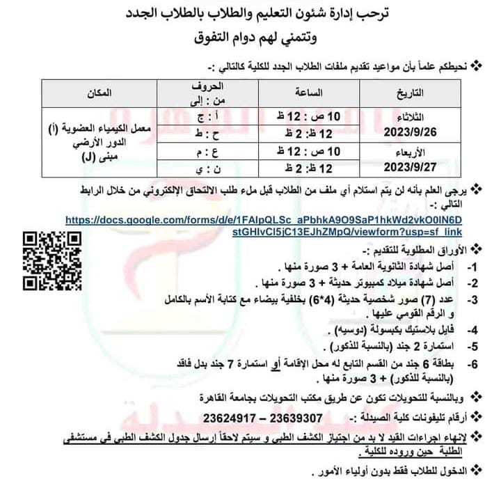 جامعة القاهرة تكشف مواعيد تقديم ملفات الطلاب الجدد بكلية الصيدلة
