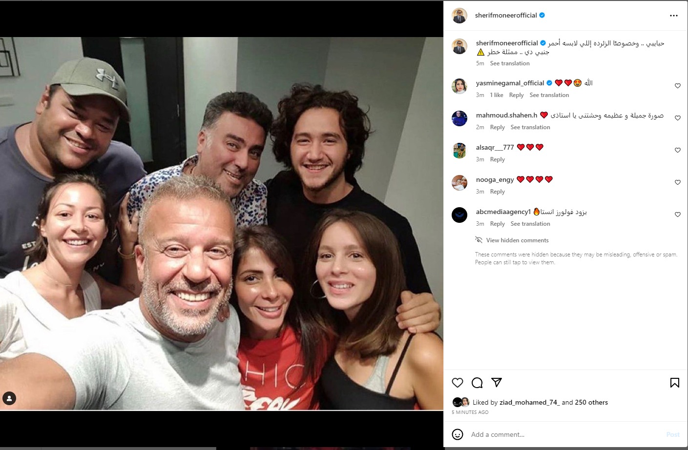 ومازح شريف منير، منى زكي في أحدث ظهور، عبر حسابه الشخصي بموقع تبادل الصور والفيديوهات القصيرة انستجرام، وعلق قائلًا: حبايبي.. وخصوصًا الزئردة اللي لابسة أحمر جنبي دي.. ممثلة خطر.