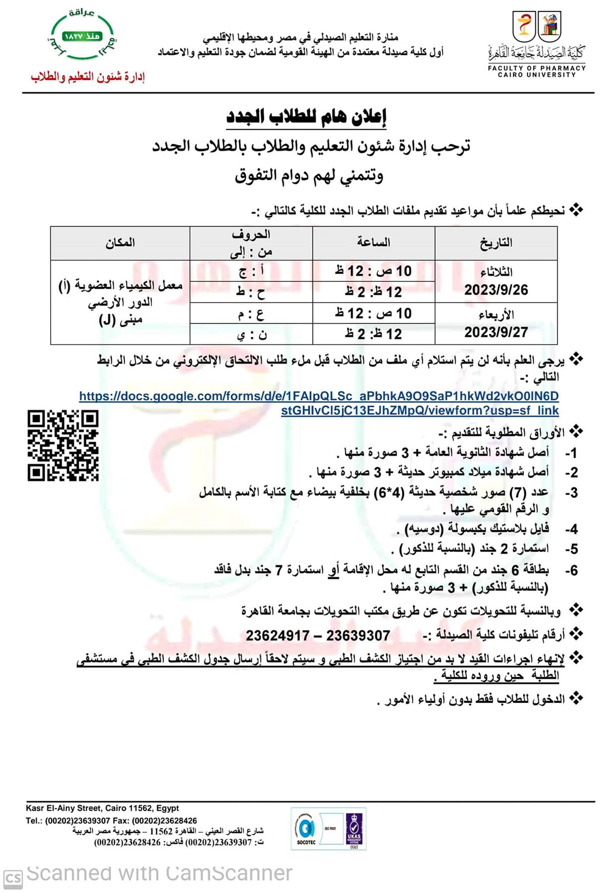 وأوضحت كلية الصيدلة جامعة القاهرة في منشور لها عبر فيس بوك: يرجى العلم بأنه لن يتم استلام أي ملف من الطلاب قبل ملء طلب الالتحاق الإلكتروني من خلال الرابط الخاص بذلك.