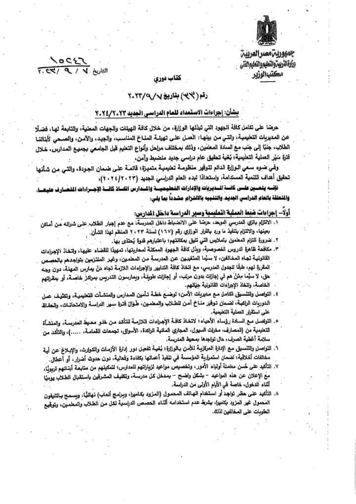وذكر خطاب موجه من وزير التربية والتعليم إلي مديري المديريات، أنه هناك عدد من الإجراءات التي يجب على المدراس والمديريات التعليمية، العمل عليها والتي من بينها: العمل على تهيئة المناخ المناسب، والجيد، والآمن، والصحي للطلاب، جنبا إلى جنب مع المعلمين، وذلك بمختلف مراحل وأنواع التعليم قبل الجامعي بجميع المدارس، خلال فترة سير العملية التعليمية بغية تحقيق عام دراسي جديد منضبط وآمن وفي ضوء سعي الوزارة الدائم لتوفير منظومة تعليمية متميزة قائمة على ضمان الجودة.