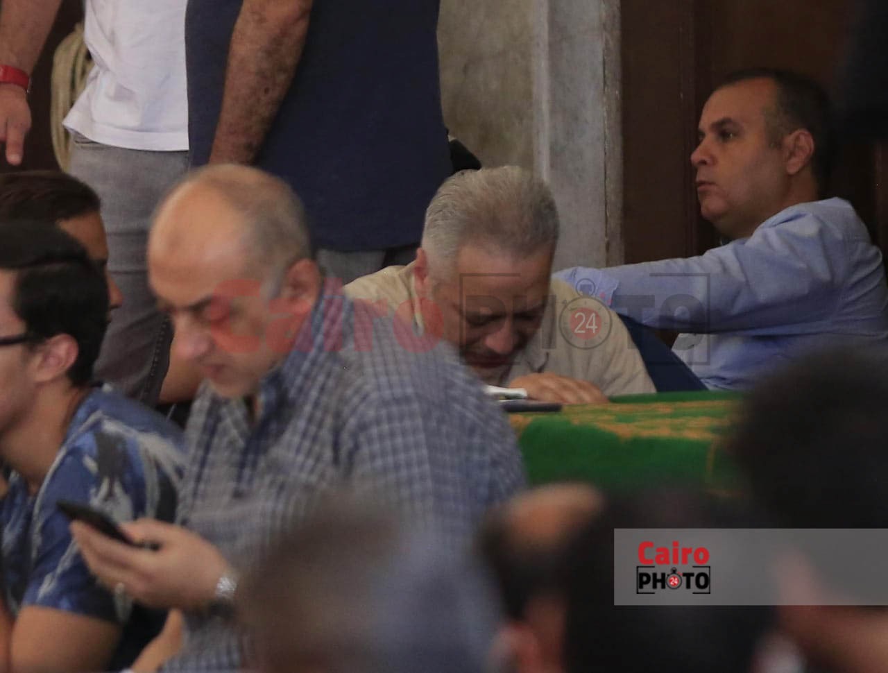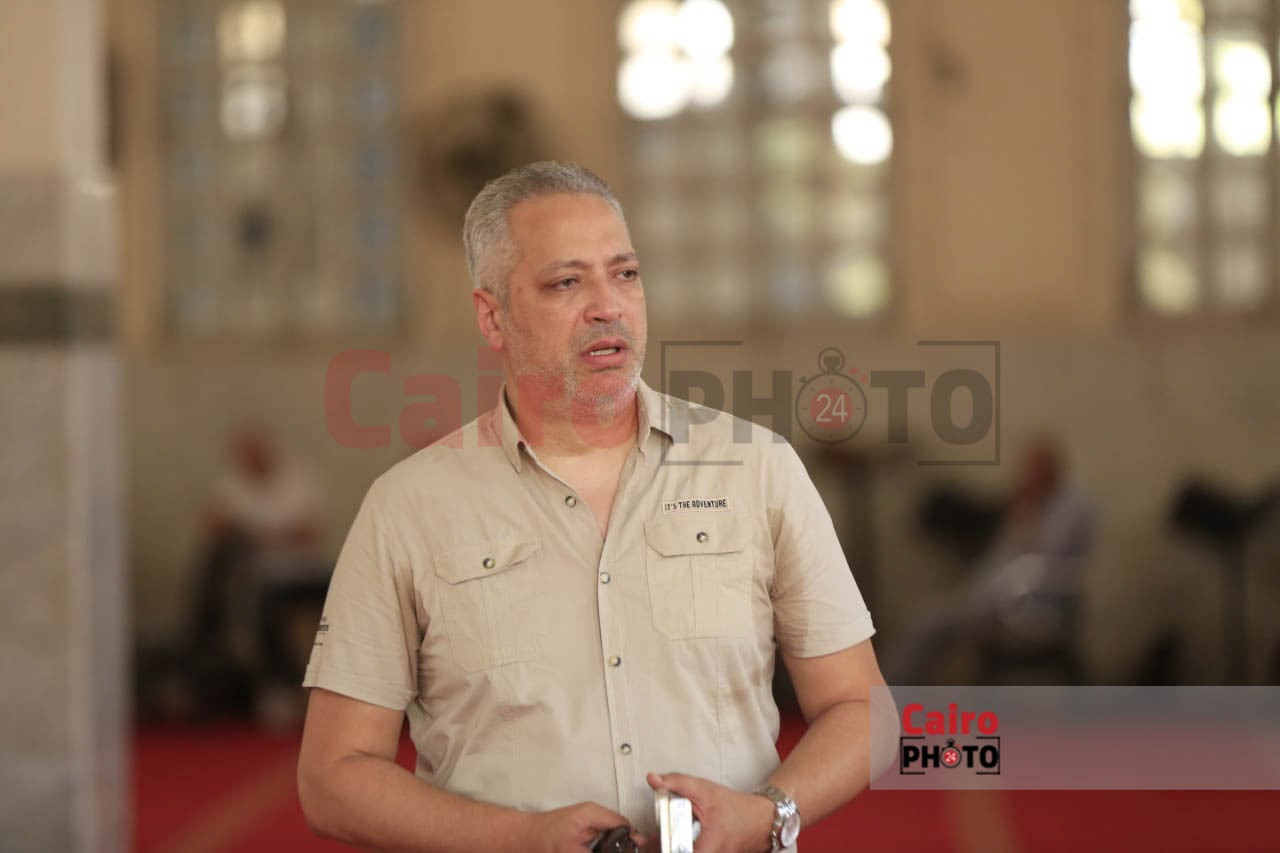الإعلامي تامر أمين أثناء جنازة والدته