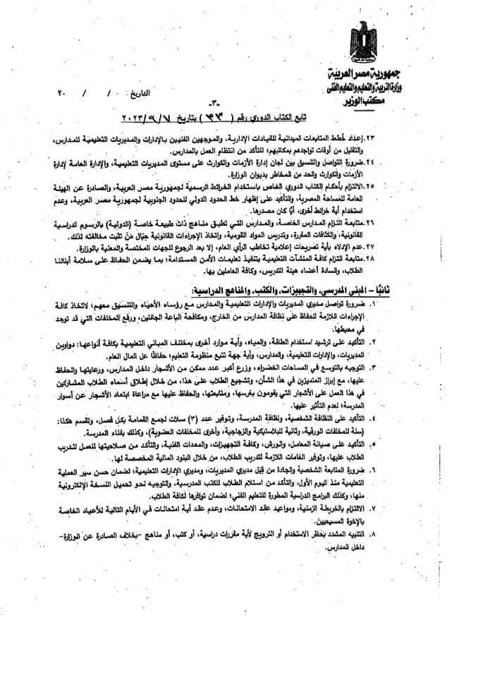 وقالت التعليم في كتابها الدوري رقم 33 والخاص بتعليمات الاستعداد للعام الدراسي الجديد، إنه يجب إتباع تعليمات ترشيد استخدام الطاقة، والمياه، وأية موارد أخرى بمختلف المباني التعليمية بكافة أنواعها: دواوين المديريات، والإدارات التعليمية، والمدارس، وأية جهة تتبع منظومة التعليم، حفاظًا على المال العام.