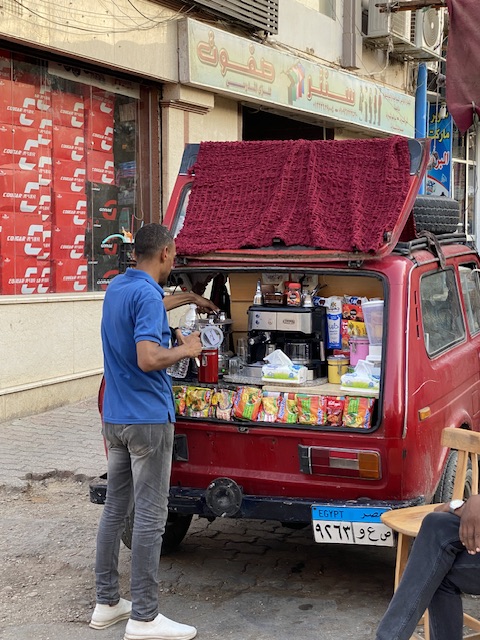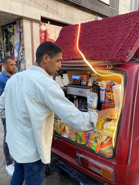 حوّل شاب أقصري في العقد الرابع من العمر؛ سيارة ملاكي يملكها كان قد أهداها له والده، إلى كافيه متنقل، وذلك لمجابهة أعباء الحياة معتمدا على نفسه وخاصة بعد زواجه وإنجابه طفلته الأولى فالرزق يحب الخفية على حد قوله.