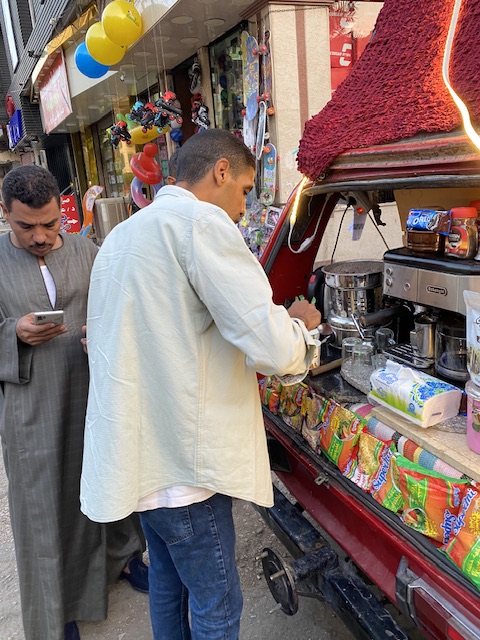 وقال زياد: شجعتني زوجتي وأهلي والعديد من الأصدقاء، والبداية كانت بغلاية مياه (كاتيل) من المنزل وماكينة القهوة اشتريتها بالتقسيط، وكنت بشتي الطلبات من سكر وشاي وقهوة على قد اليوم، والحمد الله الحال بدأ يمشي واشتريت رمالة للقهوة وبدأت الناس تعرفني وتجيلي مخصوص من كل حتة في الأقصر، وبعتبر ده رزق بنتي تاليا.