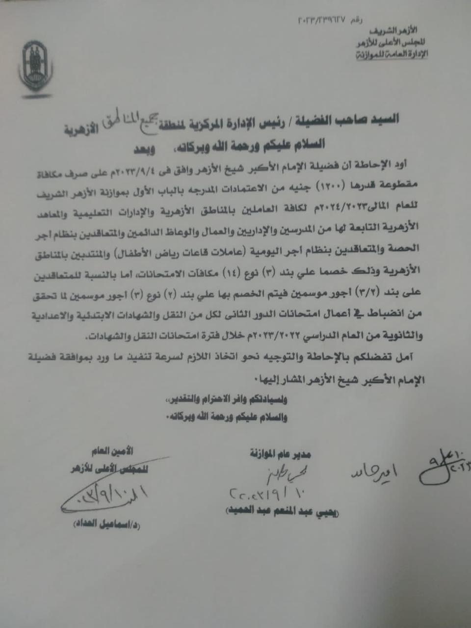 وافق فضيلة الإمام الأكبر الدكتور أحمد الطيب شيخ الأزهر الشريف، في 4 سبتمبر 2023 على صرف مكافأة مقطوعة قدرها 1200 جنيه من الاعتمادات المدرجة بالباب الأول بموازنة الأزهر الشريف للعام المالى 2024 /2023 لكافة العاملين بالمناطق الأزهرية والإدارات التعليمية والمعاهد الأزهرية التابعة لها.