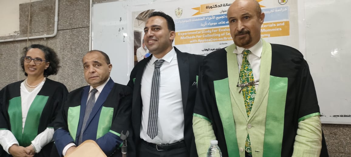 شهدت كلية الآثار بجامعة القاهرة مناقشة رسالة الدكتوراه التي تقدم بها الباحث مصطفي إسماعيل مدير مخزن المومياوات الملكية، ومشتملاتها ورئيس معمل حفظ وصيانة المومياوات في متحف الحضارة، وجاءت بعنوان "دراسة تجريبية لتقييم بعض مواد وطرق تجميع الأجزاء المنفصلة للمومياوات مع التطبيق العملي علي مومياء أثرية".