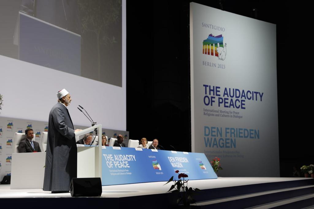 وخاطب الإمام الطيب جمهور «اللقاء الدولي من أجل السلام» بالقول: "إذا كنتم تتَّفقون –أيها السيدات والسادة- في الحقيقة التي تقول: إنَّ العالمَ كلَّه أصبح اليوم وكأنه قريةٌ واحدة، فهل نتفقُ على القول بأنَّ سلامَ العالم مرتبطٌ أشدَّ الارتباط بسلامِ الشعوب، وأنَّ المنطق الذي يُقرِّر أنَّه لا يَسلَمُ الكلُّ إلَّا إذا سَلمَ الجزء، يُقرِّر بنفسِ الدرجةِ أنَّه لا سلامَ في أوروبا بدون سلام الشرق الأوسط، وبخاصَّةٍ: سلامُ فلسطين، ولا سلامَ في آسيا دون سلام إفريقيا، ولا سلامَ في أمريكا الشمالية دون سلامِ أمريكا الجنوبيَّة".