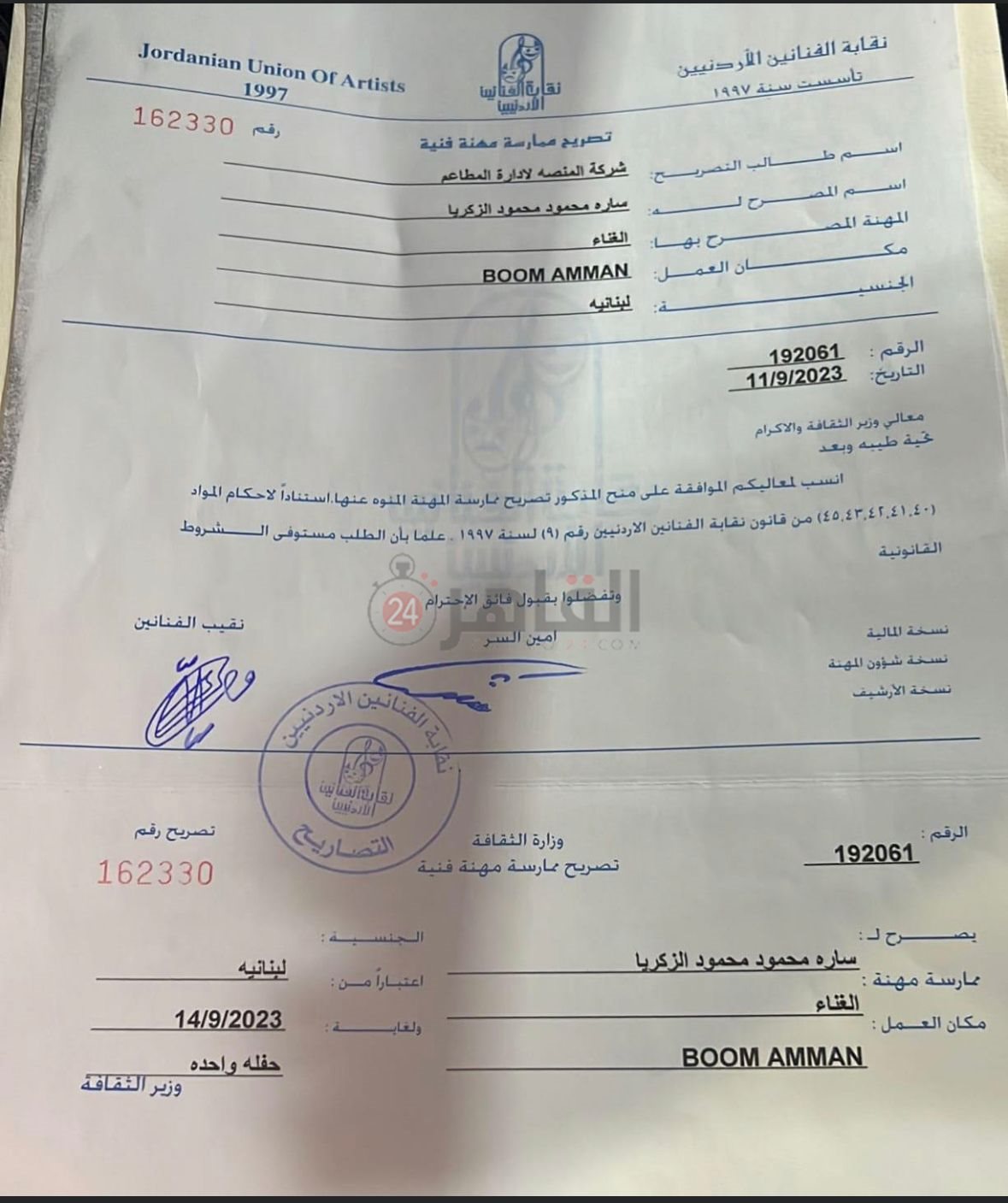 وحصل القاهرة 24، على صورة تصريح سارة زكريا لإحيائها حفلًا يوم 14 سبتمبر في عمّان بالأردن، من نقابة الفنانين بالأردن.
