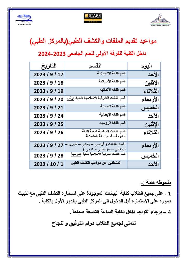 وأشارت كلية الألسن بجامعة عين شمس إلى أن الوجود يكون داخل الكلية في تمام الساعة الـ9 صباحًا، مضيفا: يوم الأحد 1 أكتوبر المقبل 2023 سيكون مخصص للطلاب المتخلفين عن مواعيد الكشف الطبي.