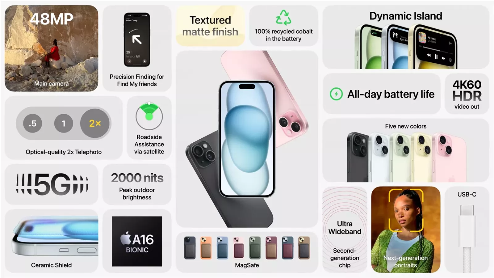 وبالنسبة لمميزات أيفون 15 iphone 15، احتفظ هاتف iPhone 15 بنفس التصميم والمواد الأساسية وإعدادت الكاميرا ذات العدستين، مع إضافة المعالج الأسرع الموجود بـ iPhone 14 Pro، بالإضافة إلى بعض ميزات الكاميرا الذكية، وخاصة الداينمك أيلاند التي تتخلص من الأذنين في الجزء العلوي من الشاشة.