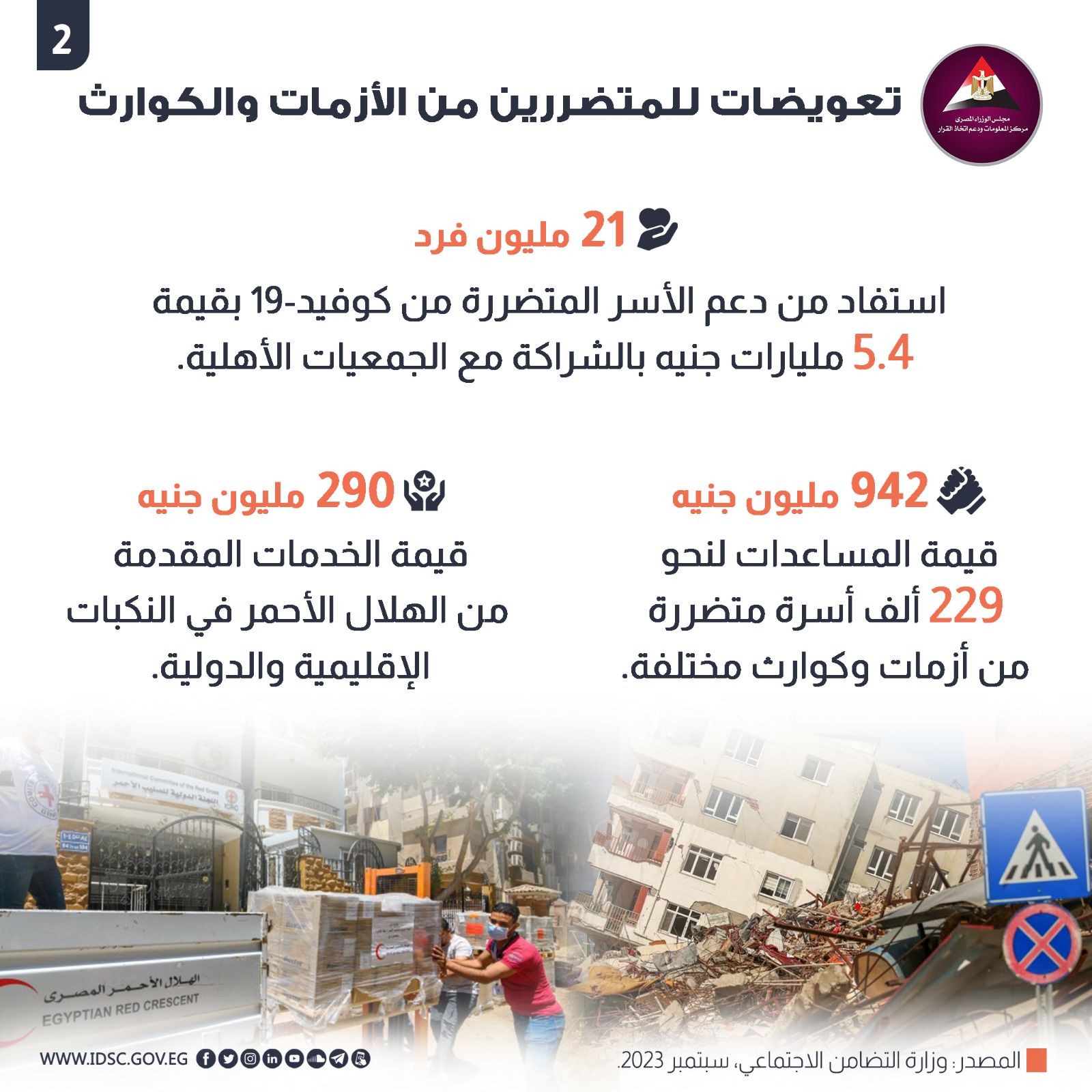 سلط مركز المعلومات ودعم اتخاذ القرار بـ مجلس الوزراء، الضوء على التعويضات المقدمة للمتضررين من الأزمات والكوارث في مصر.