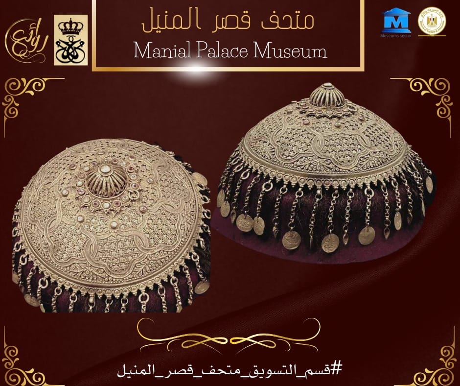 أعلنت إدارة متحف قصر المنيل، عن عرض قطعة أثرية فريدة من نوعها وهي عبارة عن حلية من الفضة تستخدم في تزيين غطاء الرأس محلاة بفصوص باللون الأحمر والأبيض، وتتدلى منها سلاسل متبادلة إحداها بها أشكال عملات.
