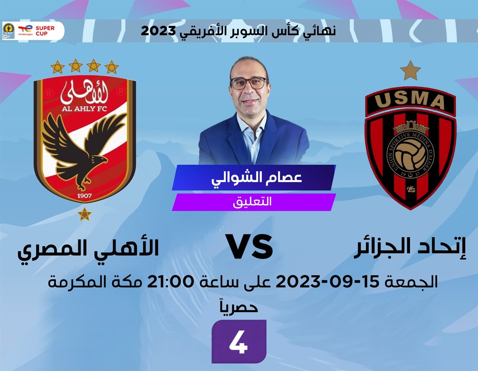 وتذاع مباراة الأهلي واتحاد العاصمة الجزائري عبر قناة بين سبورت 4، غدًا الجمعة، في تمام التاسعة مساءً على ملعب الملك فهد الرياضي في الطائف، بتعليق التونسي عصام الشوالي.