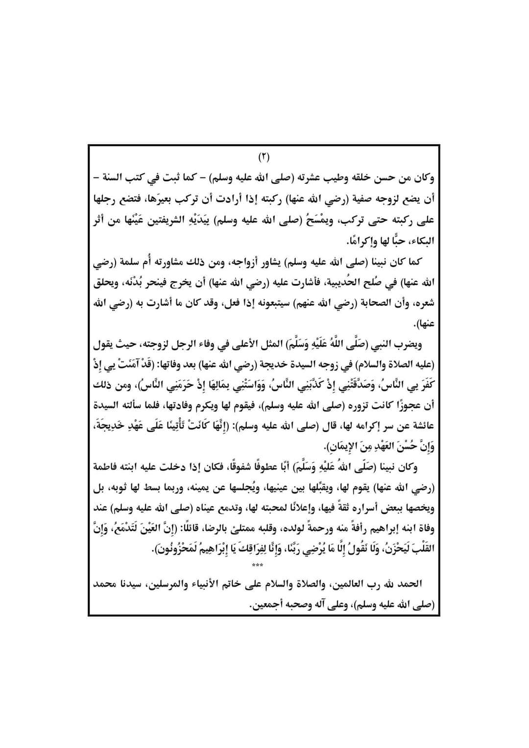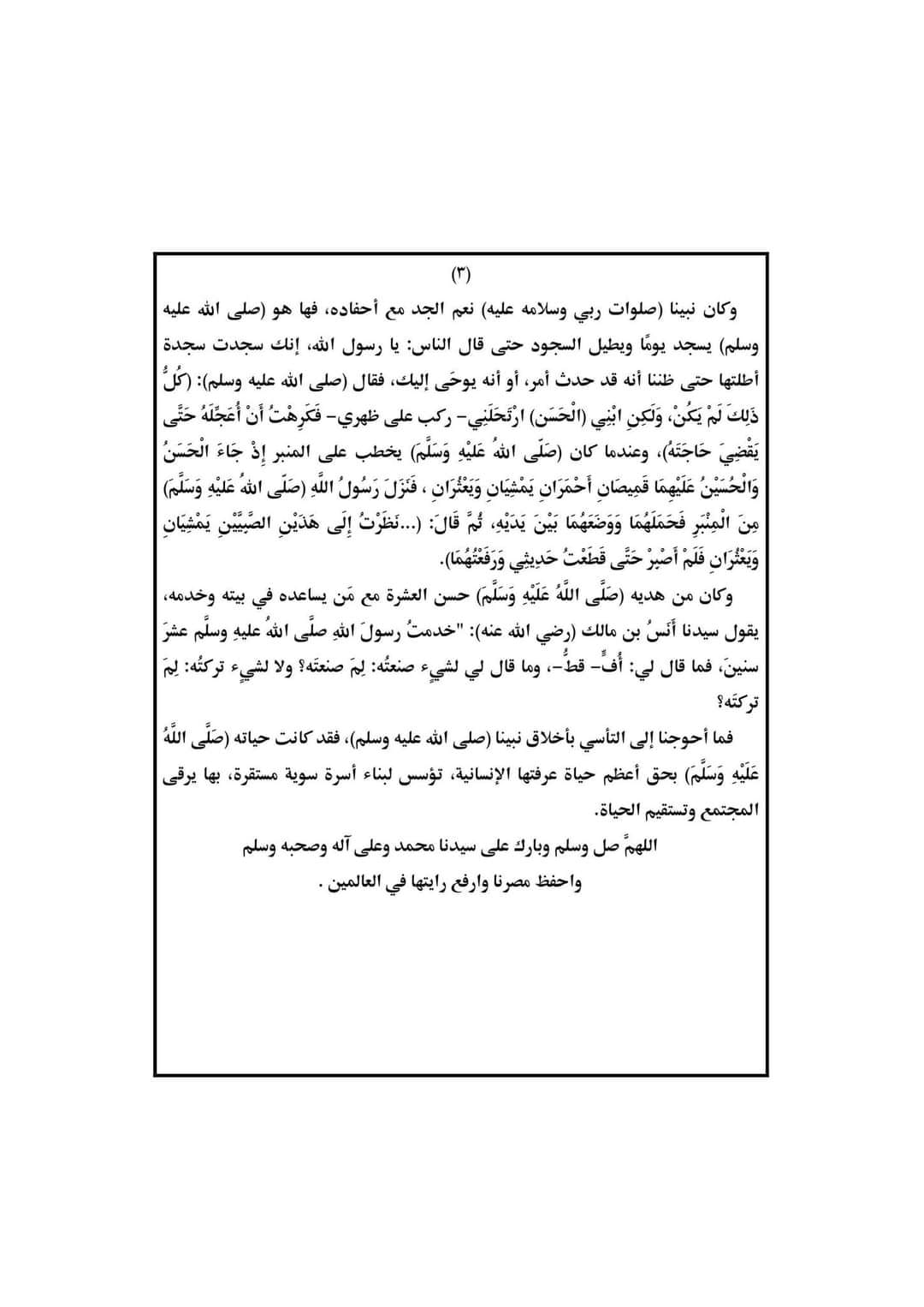 الحمد لله رب العالمين، القائل في كتابه الكريم: لقَدْ كَانَ لَكُمْ فِي رَسُولِ اللَّهِ أَسْوَةً حَسَةٌ لِمَنْ كَانَ يَرْجُو اللَّهَ وَالْيَوْمَ الآخِرَ وَذَكَرَ اللَّهَ كَثِيرًا، وأشهدُ أنْ لا إلهَ إِلَّا اللهُ وحدَهُ لا شَريكَ لَهُ، وأشهدُ أنَّ سيدنا ونبينا مُحَمَّدًا عبده ورسوله، اللَّهُمَّ صَلِّ وسلم وبارك عليهِ، وعَلَى آله وصحبه، ومَنْ تَبعهم بإحسان إلى يوم الدين، وبعد:
