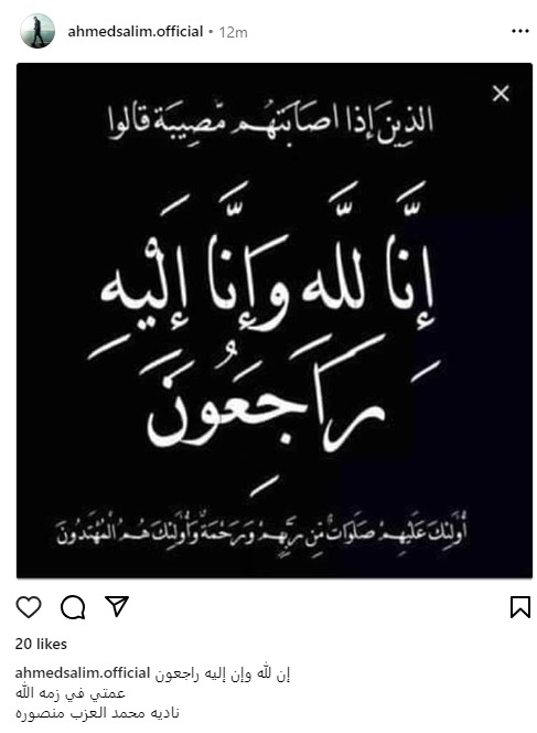 وكتب أحمد سالم منشورًا عبر حسابه الشخصي بموقع انستجرام، أعلن خلاله خبر الوفاة، معلقًا: إنا لله وإنا إليه راجعون.. عمتي في ذمة الله.