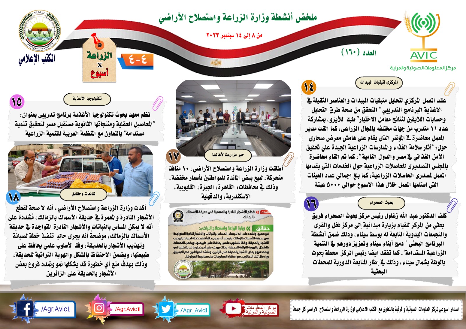 أصدر مركز المعلومات الصوتية والمرئية، التابع لوزارة الزراعة واستصلاح الأراضي، "الانفوجراف الأسبوعي" في نسخته رقم 160، حول الحصاد الأسبوعي لأهم أنشطة الوزارة، خلال الأسبوع الماضي في الفترة من 8 وحتى 14 سبتمبر الجاري.