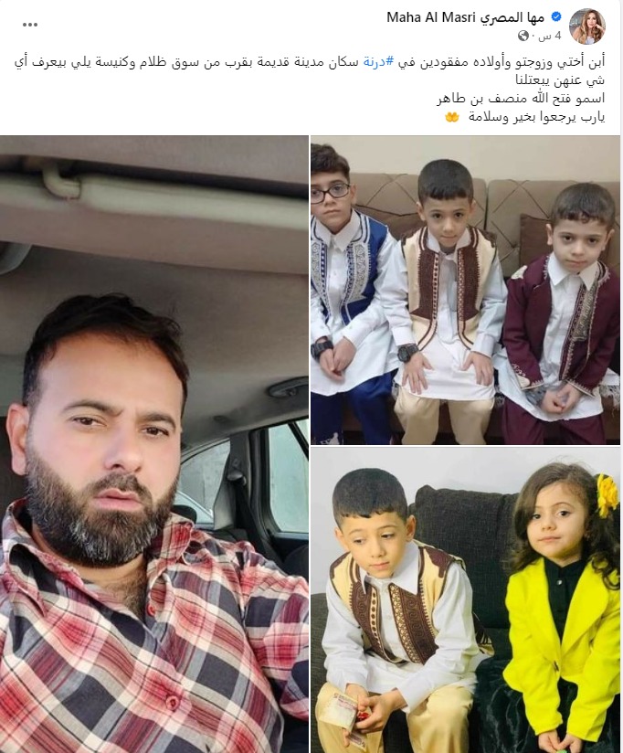 ونشرت مها المصري، صورا لـ ابن شقيقتها وأسرته عبر حسابها الشخصي بموقع التواصل الاجتماعي فيسبوك، وطلبت من متابعيها التواصل معها إذا عثر أحد منهم على ابن شقيقتها وأسرته، وعلقت قائلة: ابن أختي وزوجته وأولاده مفقودين في ليبيا سكان مدينة قديمة بالقرب من سوق ظلام وكنيسة، يلي بيعرف أي شي عنهن يبعتلنا، اسمه فتح الله منصف بن طاهر، يا رب يرجعوا بخير وسلامة.
