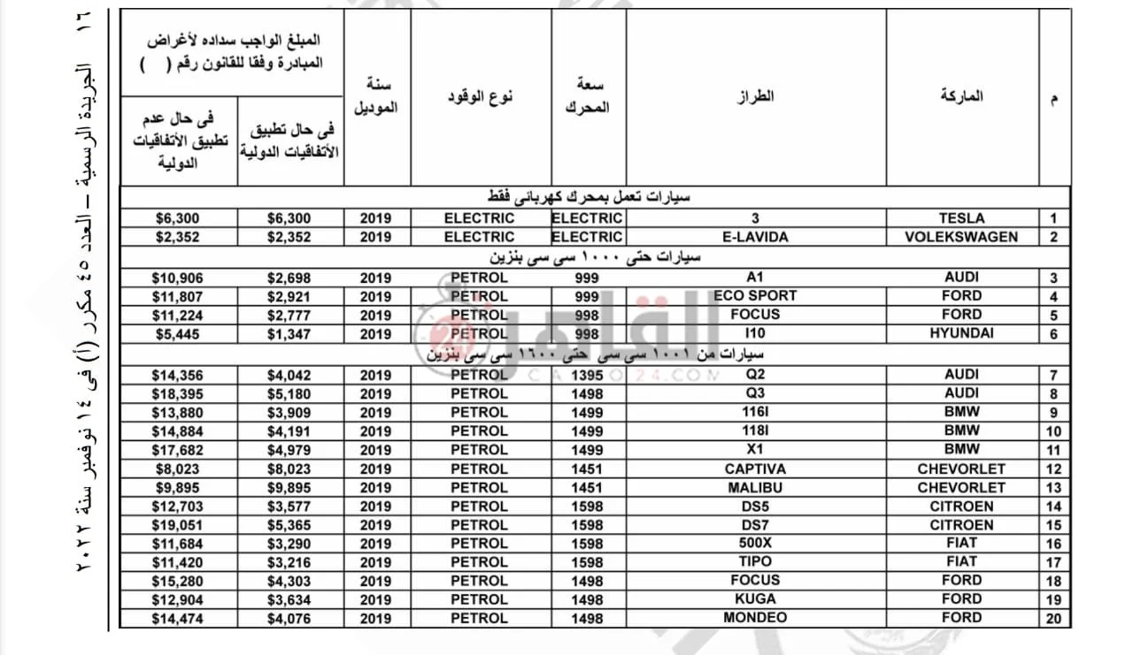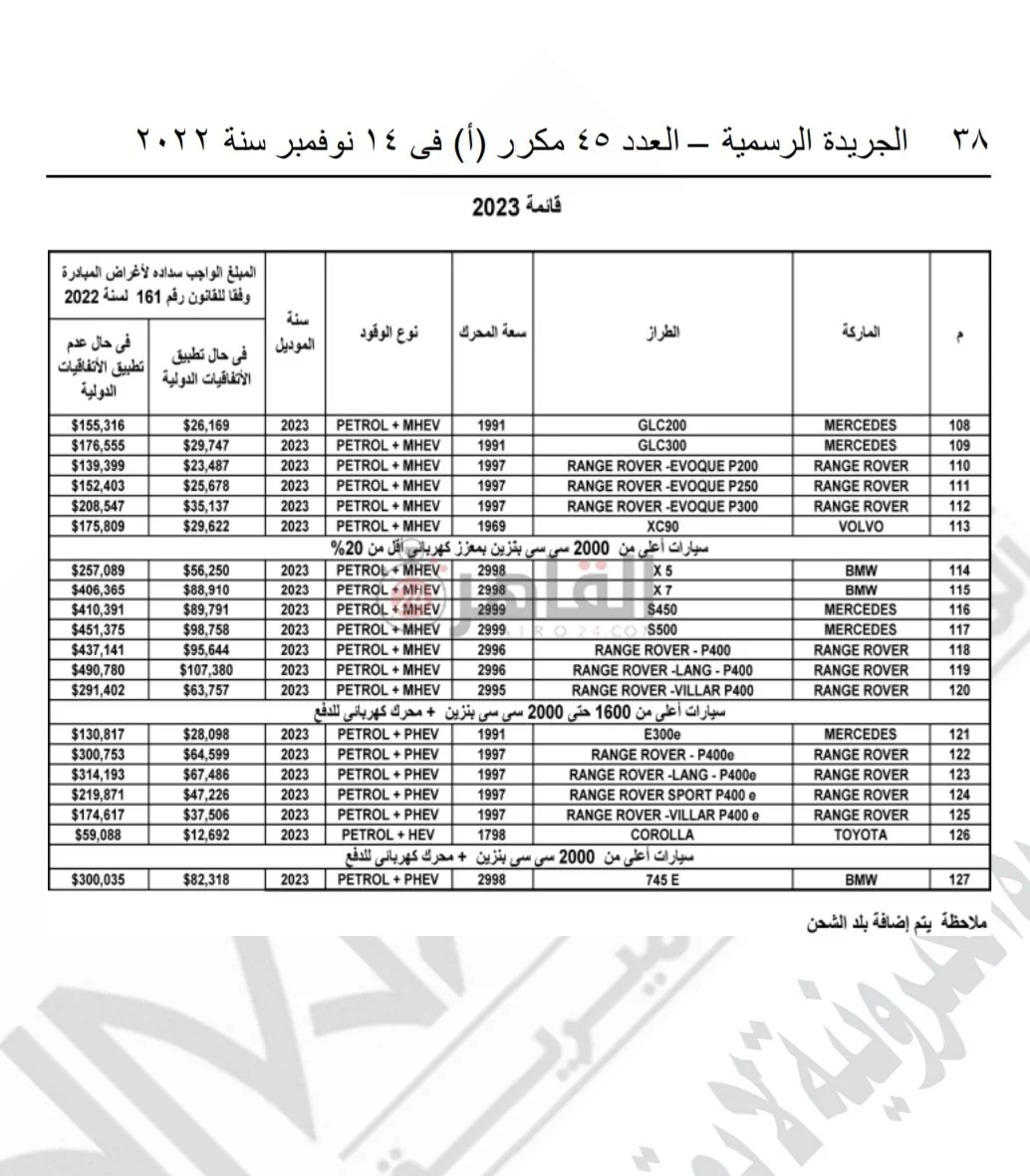 وفيما يلي بعض جداول جمارك سيارات المغتربين لأبرز الطرازات وفقًا لما أعلنته الحكومة: